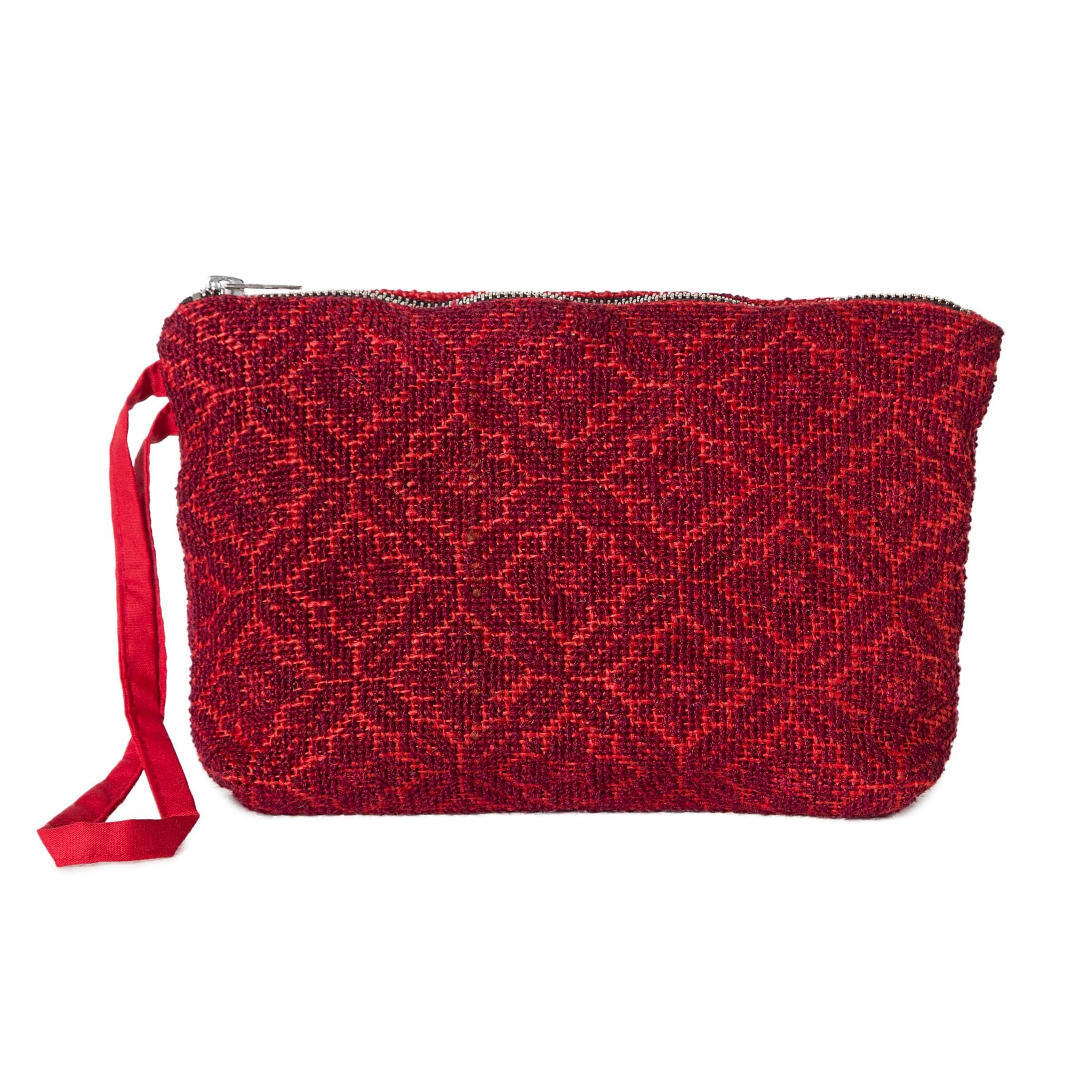 Coloured jute, hand-embroidered featuring the Poppy pattern and a comfortable cotton handle so it is practical to hold it or hang it
