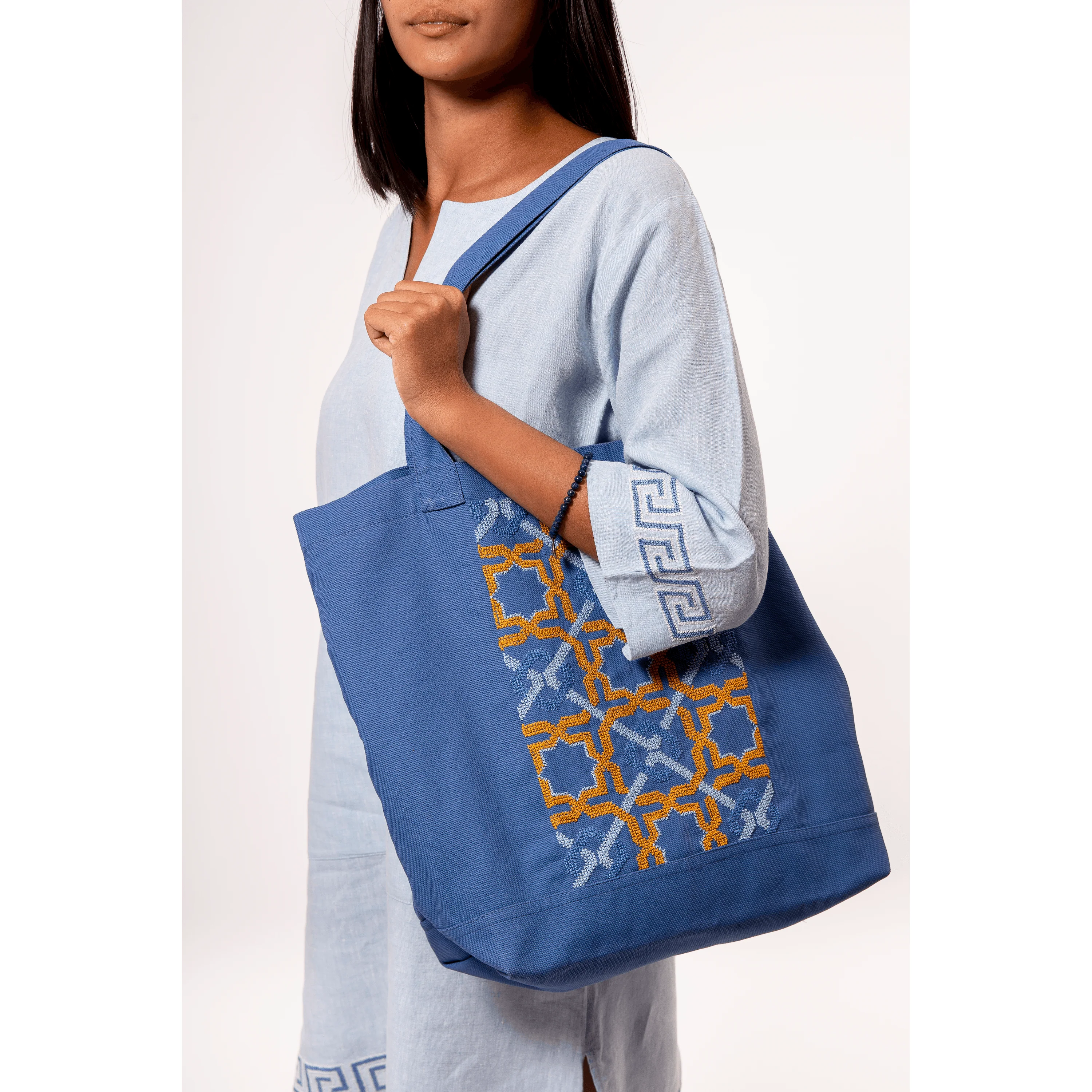 Avio blue with saffron details, 100% cotton canvas bag featuring a generous inside pocket with button-close and a full size hand-embroidered iconic Alhambra pattern.Â
