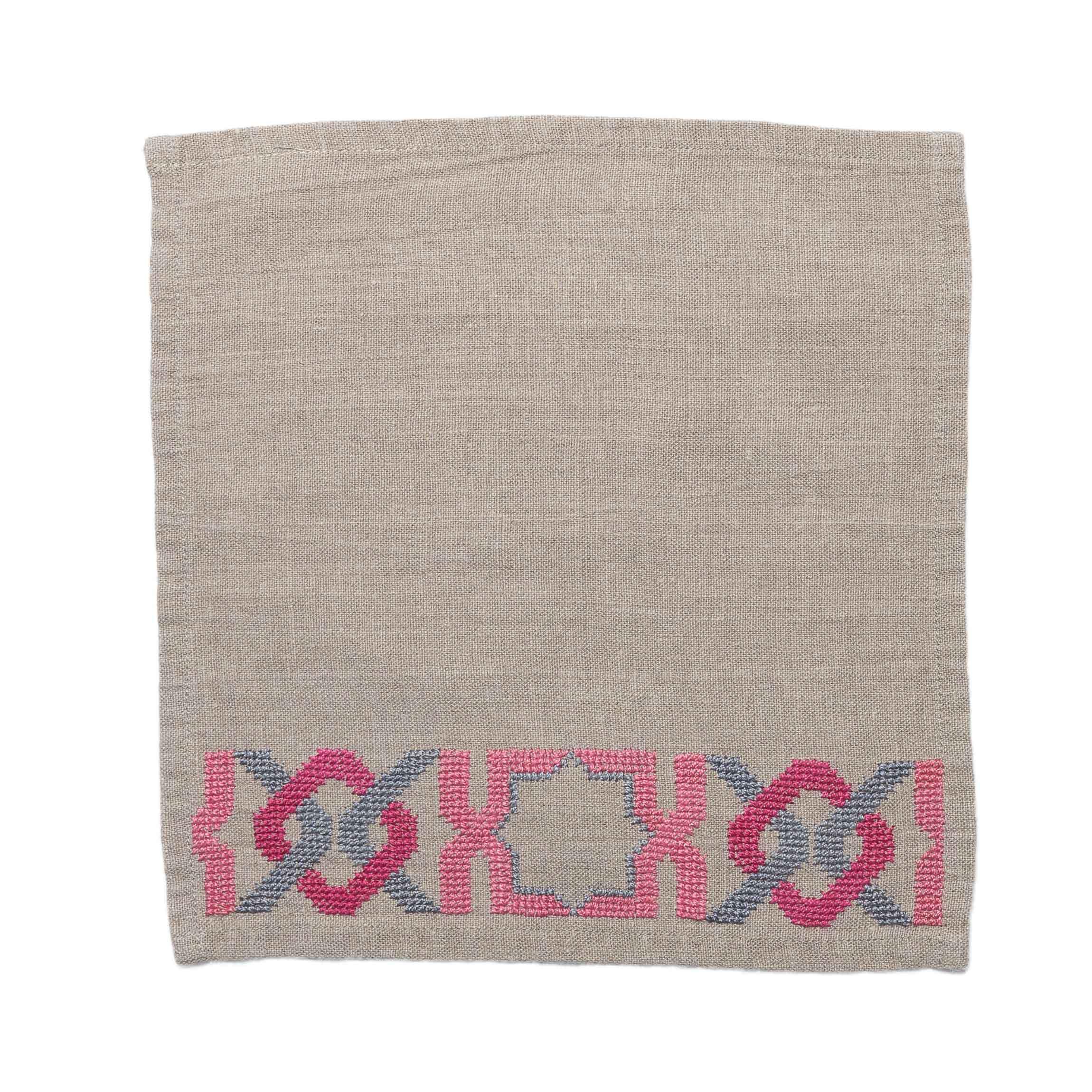Luxury, soft, highly absorbing natural washed and softened linen towel, featuring the Alhambra pattern in tonal shades of pink, gray and raspberry.